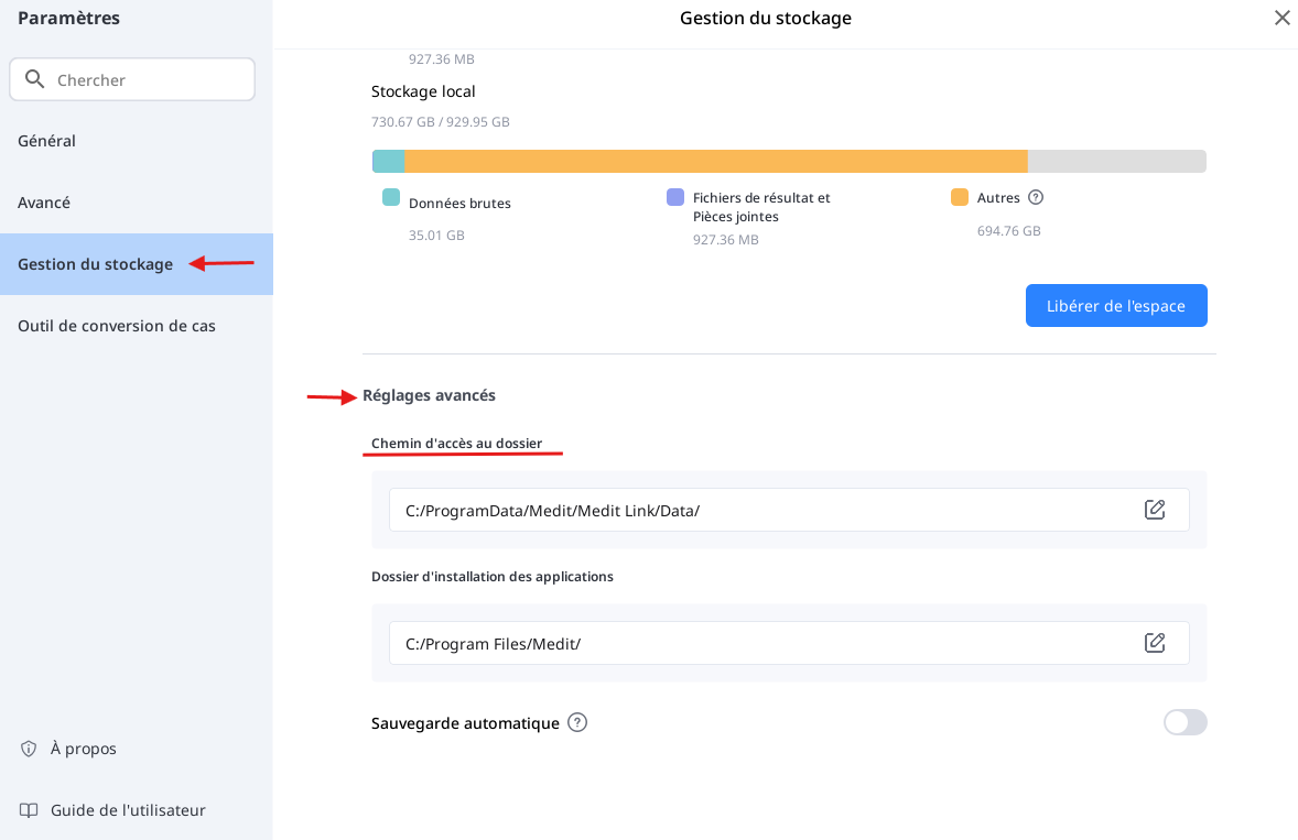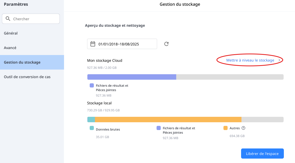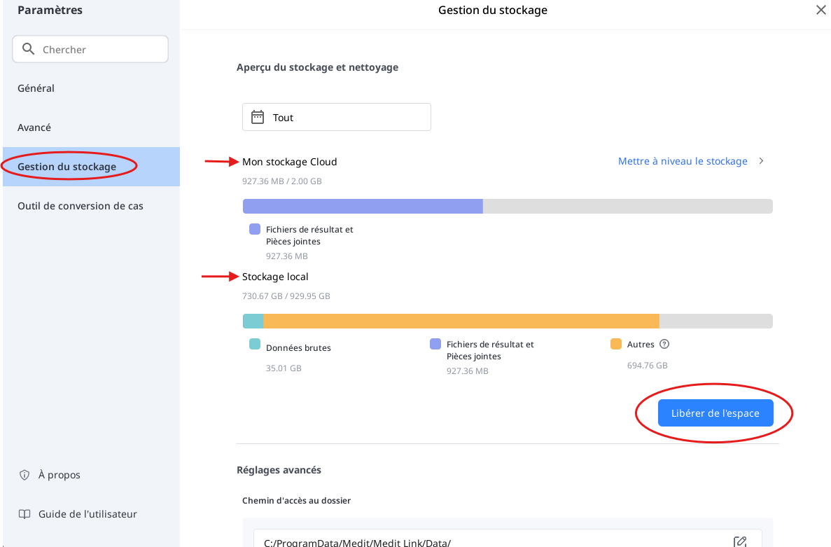 Vous pouvez également, vous rendre dans les paramètres du logiciel Medit Link, à la rubrique "Gestion du stockage" et sélectionner: Mettre a niveau le stockage.