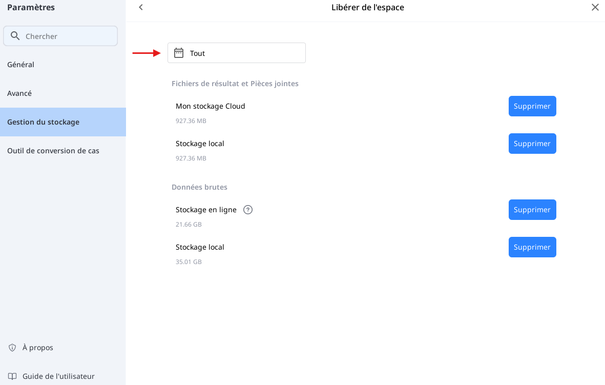 Pour ce faire, cochez simplement la case (données brutes) sur la partie "stockage sur PC local" puis "supprimer" pour libérer de l'espace. Vous pouvez définir une période à supprimer.